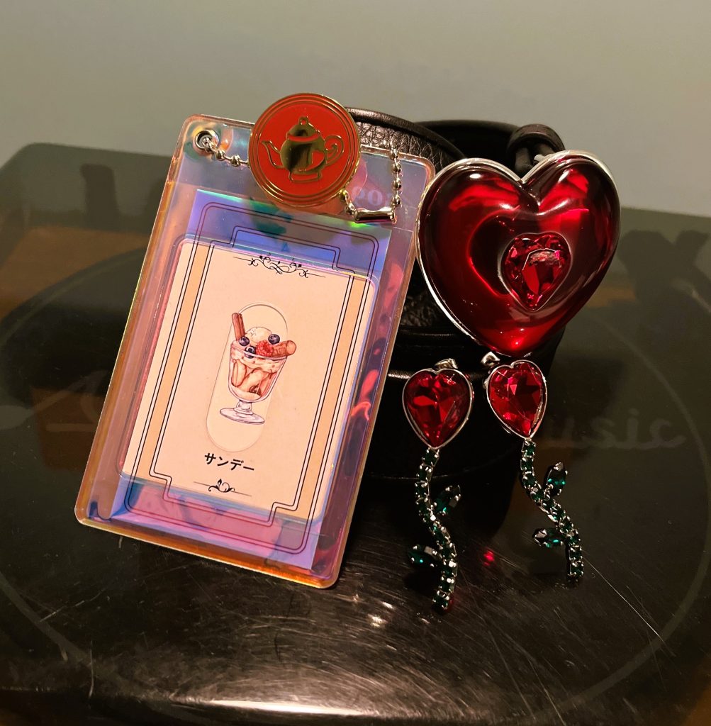 黒地に赤いフリンジのワンピース、ハートを薔薇に見立てたピアスとハートバングルのベルト、と